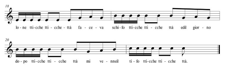 ‘n cazzòtto su ciarvèllo.LA FRANGIÒTTOLA DE LA MATRE E LE FIJJE SCIÒCCHECc’ èra ‘na matre e ttre fijje ‘m bò sciòcche, e queste ttre fijje parlàvono male, nun zzapévono parlà.