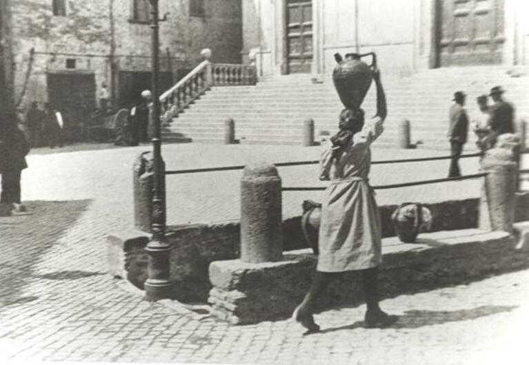 La fontana di piazza“Prima che l’amministrazione podestarile, non “addusse” nuove “acque fresche e chiare” con numerose fontanelle rionali e fin dentro le case, tutta la popolazione beveva alla vecchia fontana, le donne vi si recavano con le brocche di coccio che, sebbene pesanti, venivano portate senza apparente sforzo sopra la testa, appoggiate ad uno straccio arrotolato “la torcèlla”. (Di Marcantonio A., Un’ isola d’oro, De Luca 1960, Roma, p. 44.)I viaggi per prendere l’acqua erano un rito sociale.